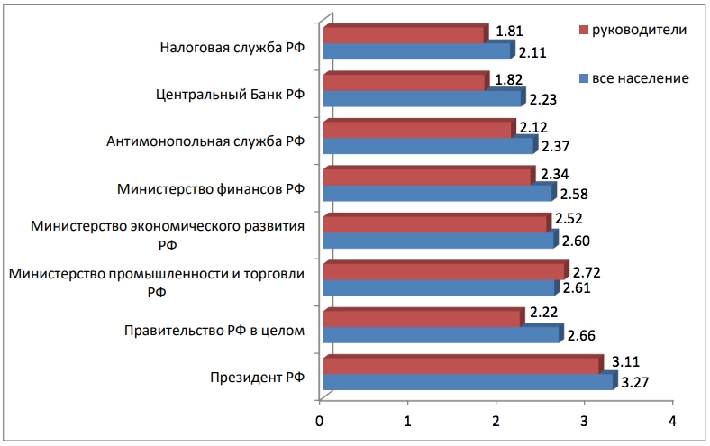 Согласно аналитическому отчету, высоким уровнем доверия россиян среди всех институтов власти пользуется только глава государства. Самую малую степень доверия имеют Центробанк (5,2%) и Федеральная налоговая служба (4,2%) — и оба они лидируют по показателю недоверия граждан: 36% и 35,5% соответственно.