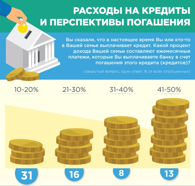 Более половины россиян (51%) тратят на ежемесячное обслуживание кредитов от 10% до 20% семейного бюджета. Еще 16% вынуждены тратить на погашение займов от 21% до 30% дохода. Для 13% имеющих кредиты сумма ежемесячного платежа составляет от 41% до 50% бюджета.