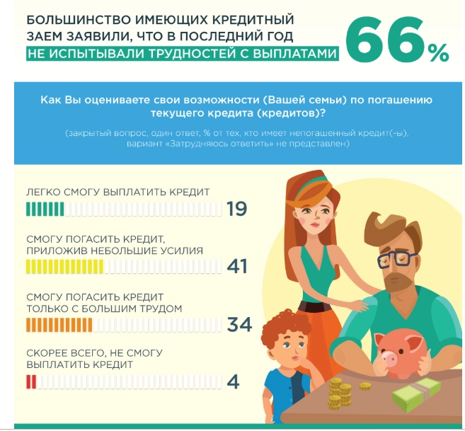 66% наших сограждан заявили, что в последний год никаких трудностей с выплатами по кредитам они не испытывали. У 33% опрошенных, напротив, такие случаи были. В основном это молодежь в возрасте от 18 до 24 лет и от 25 до 34 лет.