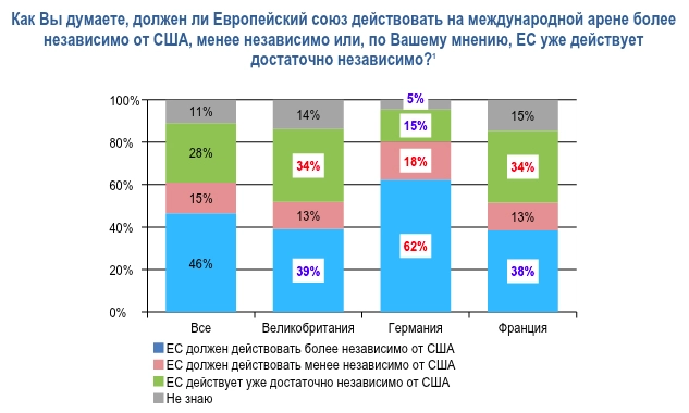 Эту точку зрения подтверждают и масштабные социологические исследования. «Ридус» уже приводил результаты опроса ICM Research, согласно которым 46% граждан Евросоюза уверены, что ЕС должен действовать независимо от США: