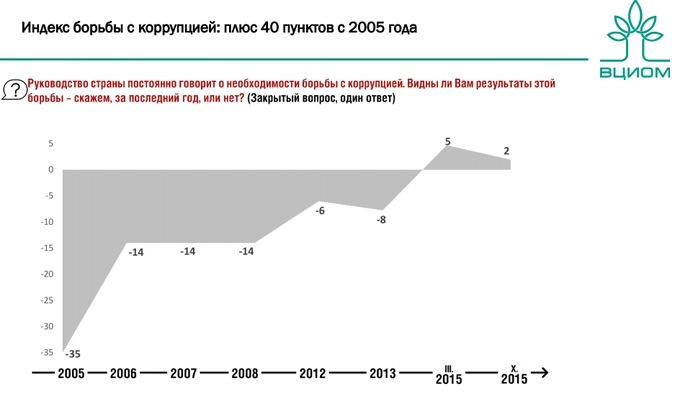 Согласно полученным в ходе социологического исследования данным, успехи в борьбе с коррупцией позитивно отразились на общественных настроениях в России. На это, в частности, указывает Индекс борьбы с коррупцией — показатель, агрегирующий мнение россиян об успешности борьбы руководства страны с коррупцией. Примечательно, что впервые за десяток лет этот параметр перевалил из области отрицательных в область положительных значений: