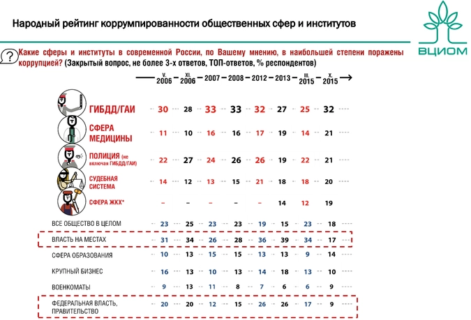 Вместе с тем он отметил, что первую строчку в рейтинге коррумпированности органов власти, согласно данным последнего исследования, заняла ГИБДД (показатель коррумпированности ведомства увеличился с 25% до 32%). В топ лидеров также вошли полиция (21%) и сфера медицины (21%).