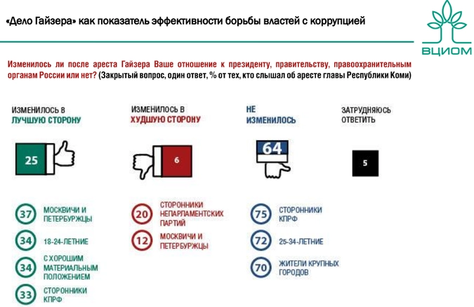 Социологи также выяснили, что за судьбой заключенного под стражу по обвинению в организации преступного сообщества и мошенничестве в особо крупном размере главы Коми Вячеслава Гайзера следили 60% россиян. Любопытно, что после «дела Гайзера» каждый четвертый респондент стал лучше относиться к руководству страны: