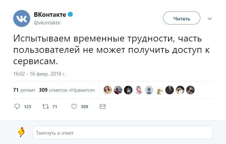 Интернет-сервис перестал работать в 15:45 по Москве. «К сожалению, сервер временно недоступен. Попробуйте повторить действие чуть позже», — гласит сообщение на vk.com.