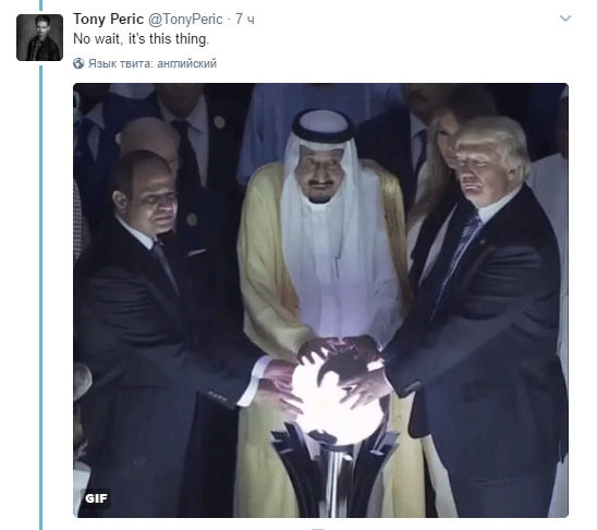 Вторая по популярности версия связана с необычным глобусом, с которым Дональд Трамп сфотографировался в компании короля Саудовской Аравии и президента Египта во время визита в Эр-Рияд. Глобус выглядит как светящийся шар, и снимок быстро стал предметом для шуток и фотожаб о таинственных ритуалах американского лидера.