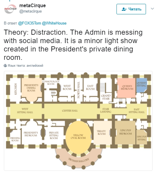 Любители загадок разыскали план-схему Белого дома и установили, что таинственные вспышки происходили в президентской столовой. Объясняя их происхождение, некоторые СМИ решили, что таким образом Трамп отвлекает соцсети от каких-то других, действительно важных событий.