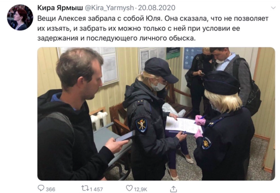«Вещи Алексея забрала с собой Юлия, — писала Ярмыш в Twitter. — Она сказала, что не позволяет их изъять, и забрать их можно только с ней при условии ее задержания и последующего личного обыска».