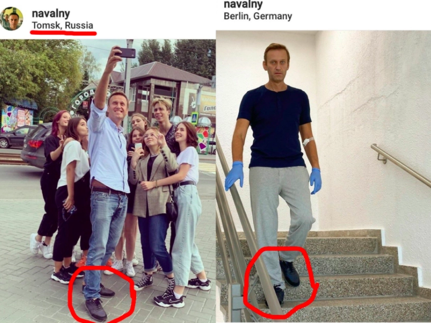 Затем обитатели соцсетей сравнили снимки в Instagram Навального и обнаружили знакомые ботинки на фото блогера из берлинской клиники Charite.