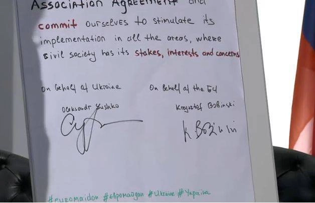 «Мы подписываем соглашение об ассоциации между Украиной и ЕС и берем на себя обязательство содействовать его реализации во всех сферах, где гражданское общество имеет свои цели, интересы и беспокойство», – говорится в соглашении.