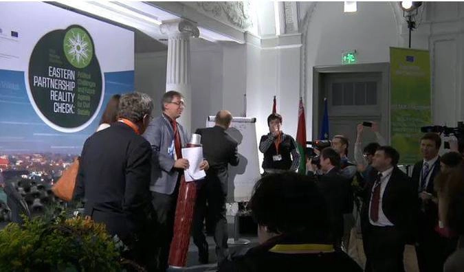 Под символичным соглашением, используя огромную ручку, оставили свои подписи координатор Украинской национальной платформы форума гражданского общества «Восточное партнерство» Александр Сушко и сопредседатель форума гражданского общества «Украина – ЕС» Кристофер Бобински, пишет РБК.