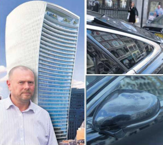 Солнечные блики от строящегося в Лондоне 37-этажного небоскреба Walkie Talkie расплавили припаркованный рядом с ним дорогой автомобиль Jaguar XJ.