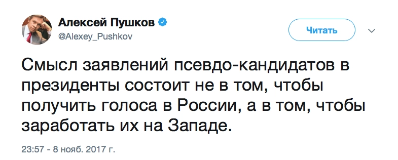 «Смысл заявлений псевдокандидатов в президенты состоит не в том, чтобы получить голоса в России, а в том, чтобы заработать их на Западе», — написал Пушков в своем Twitter.
