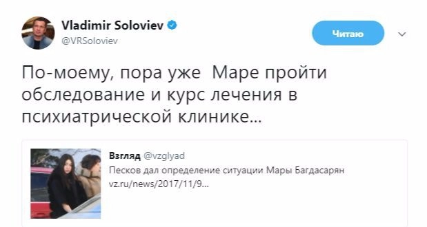 На своей странице в Twitter российский телеведущий Владимир Соловьев заявил, что лишенной водительских прав стритрейсерше Маре Багдасарян следует обратиться к психиатру.