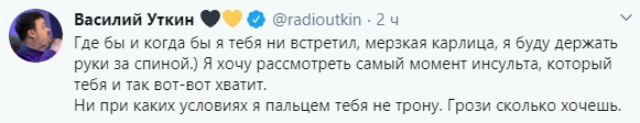 Соловьев также посоветовал Уткину смотреть в оба и озираться по сторонам. Тот в свою очередь не стал долго тянуть с ответом и написал в своем Twitter: «Где бы и когда бы я тебя ни встретил, мерзкая карлица, я буду держать руки за спиной. Я хочу рассмотреть самый момент инсульта, который тебя и так вот-вот хватит».