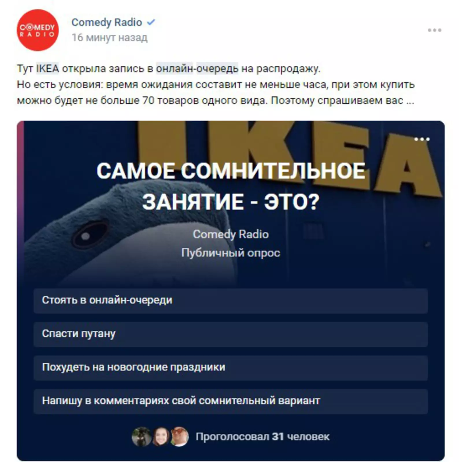 Comedy Radio даже устроило ехидный опрос, какое занятие является более сомнительным — стоять в онлайн-очереди, худеть к Новому году или спасать девушек с пониженной социальной ответственностью.