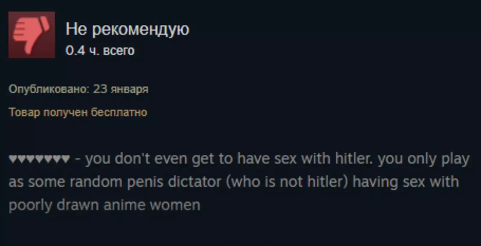 «***, тут даже секса с Гитлером-то нет. Вы играете за какого-то рандомного вождя диктатуры пенисов (это явно не Гитлер), трахающегося с плохо нарисованными анимешными девочками».