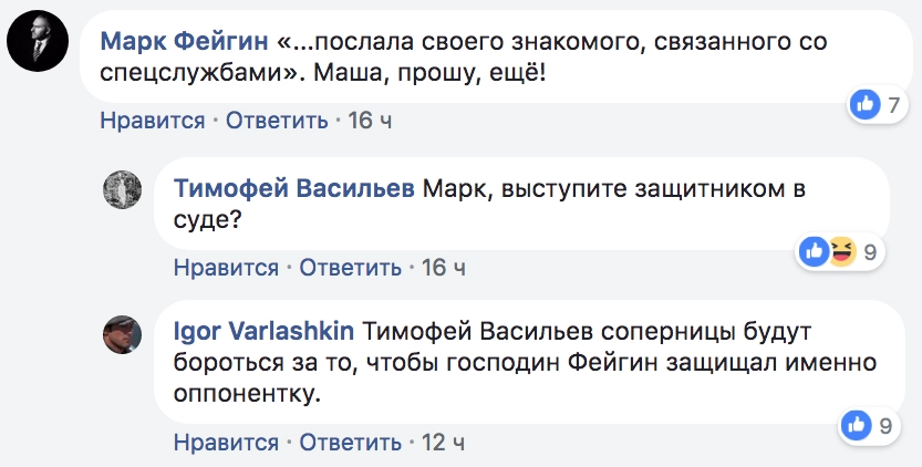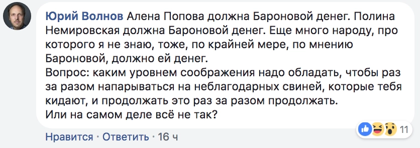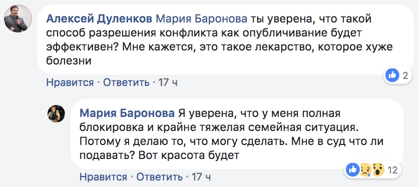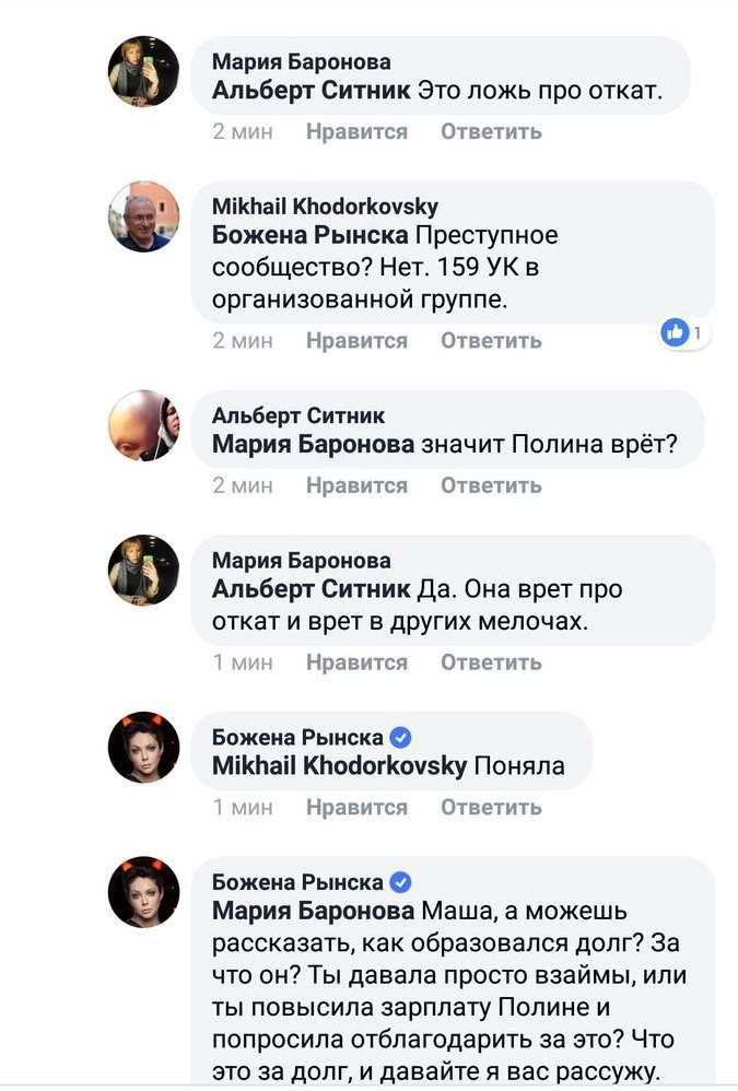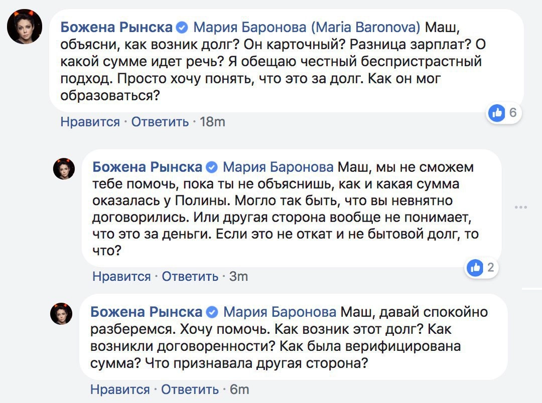 Вскоре последовал ответ Немировской: как пояснила активистка в Facebook, Баронова требует откат.