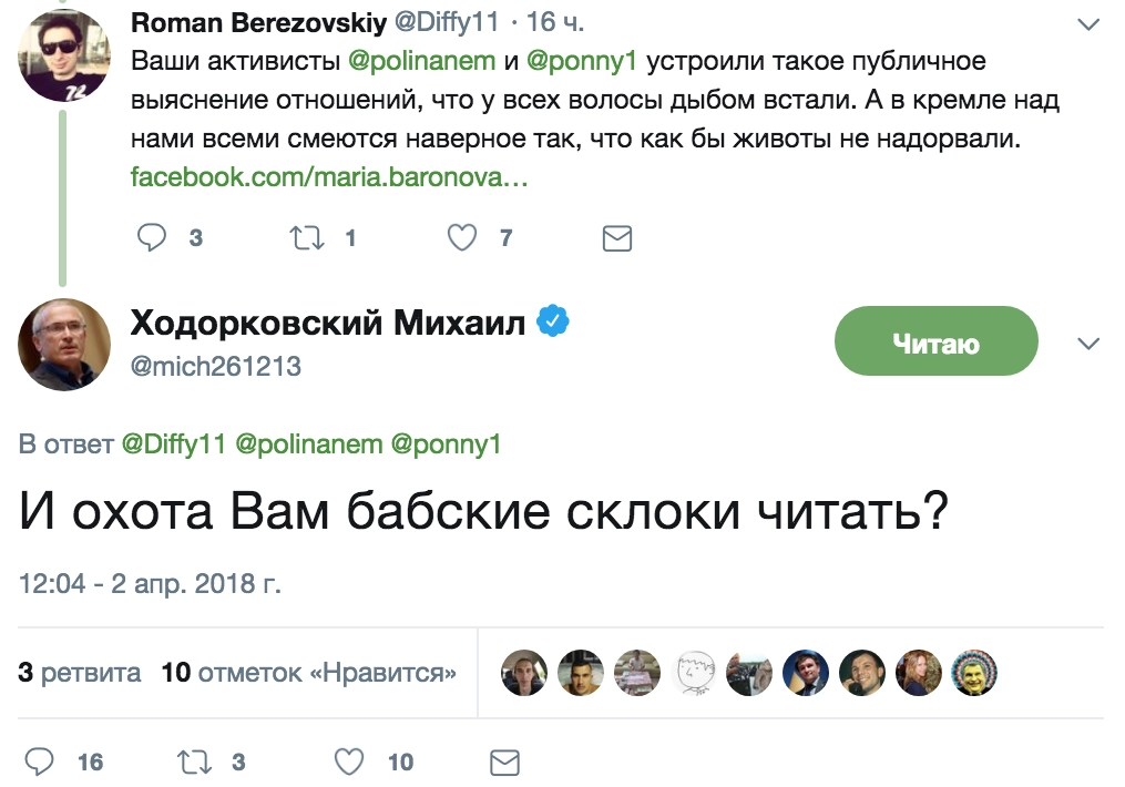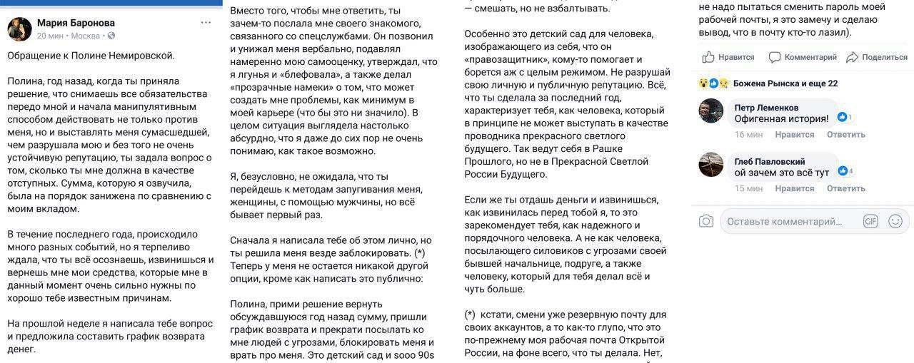 Главный спор Рунета начался с открытого письма Бароновой своей бывшей коллеге по «Открытой России» Михаила Ходорковского. В публикации, доступной для всех пользователей Facebook, Баронова напомнила Немировской о необходимости вернуть долг — своеобразные отступные после прекращения деловых отношений.