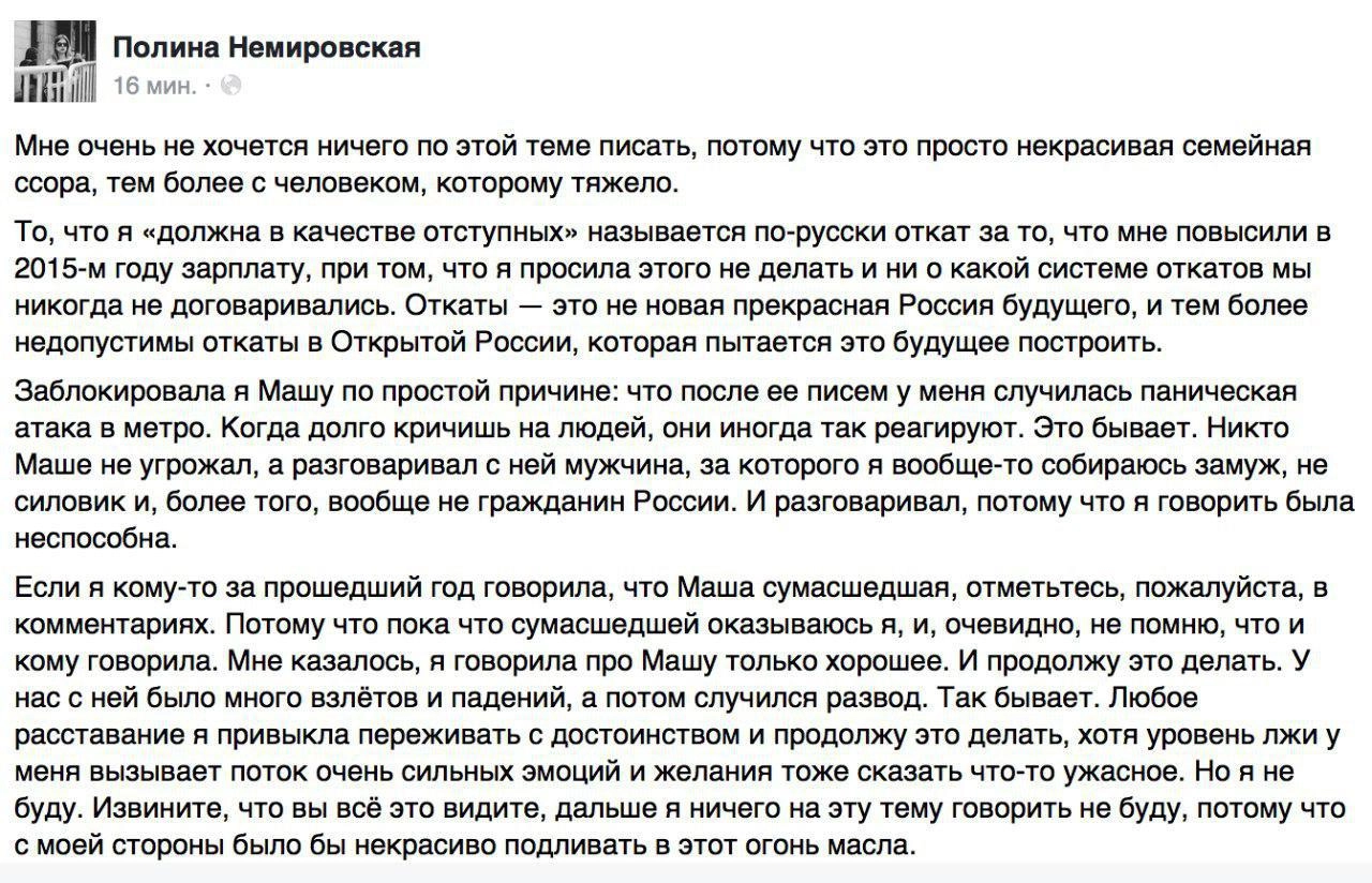 То, что я „должна в качестве отступных“, называется по-русски откат за то, что мне повысили в 2015 году зарплату, при том что я просила этого не делать и ни о какой системе откатов мы никогда не договаривались. Откаты — это не новая прекрасная Россия будущего, и тем более недопустимы откаты в „Открытой России“, которая пытается это будущее построить,написала Немировская.