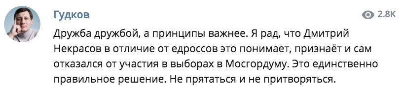 Лишили справедливо, претензий к Диссернету у меня никаких нет. Эта история заставила меня окончательно решить для себя и вопрос с выборами в МГД. Я и так сильно сомневался по этому поводу, ибо прошлая попытка пойти на выборы закончилась очень больно, а серьезных собственных денег на войну с мельницами я больше тратить не готов. Да и сам я пока ничего не писал о выдвижении, хоть и был заявлен в списке Гудкова, — написал Некрасов в Facebook.