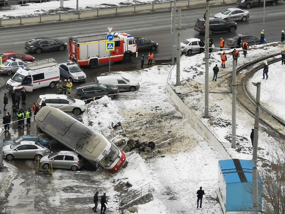 Сошедший с рельсов трамвай упал на машины у ТЦ в Самаре: видео