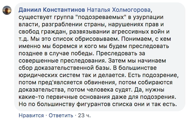 На вопросы правозащитницы и обитателей соцсети вызвался ответить член Постоянного комитета Форума свободной России Даниил Константинов. Впрочем, своими репликами он лишь подтвердил догадку Холмогоровой:
