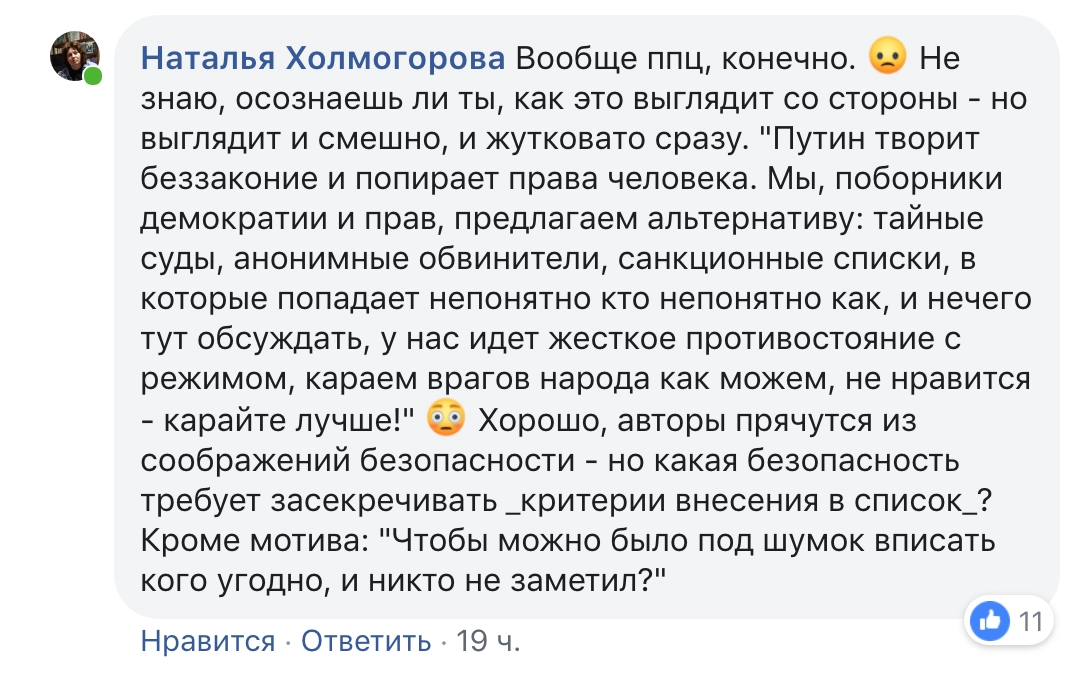 Получается у нас вот что. Собрались непонятно кто, обсудили непонятно как, на основе критериев, известных только им самим, составили список «преступников», подлежащих наказанию. Кто из преступников в чем конкретно виноват — понять невозможно. Проверить и оценить работу составителей, понять, почему включен тот и не включен этот — невозможно тоже. «Мы с товарищами посоветовались и решили…» Такая вот демократия, такое правосознание, — заключила Холмогорова.