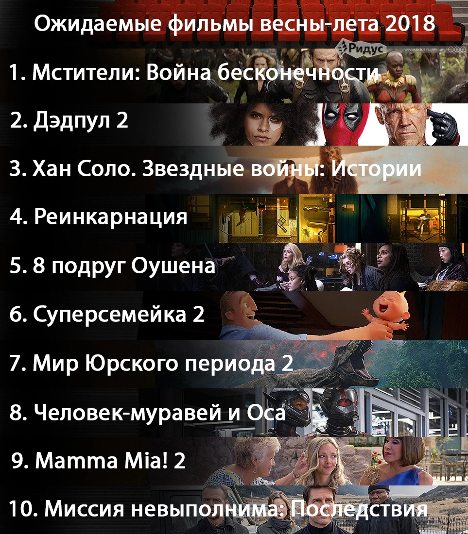 Топ-10, составленный изданием USA Today, возглавил кинокомикс «Мстители: Война бесконечности», представляющий собой третью часть популярной киносерии о супергероях. В США он стартует 27 апреля, а в России — 3 мая. Главная интрига этой ленты — борьба Железного человека и компании с космическим суперзлодеем Таносом, победить которого еще никому не удавалось.