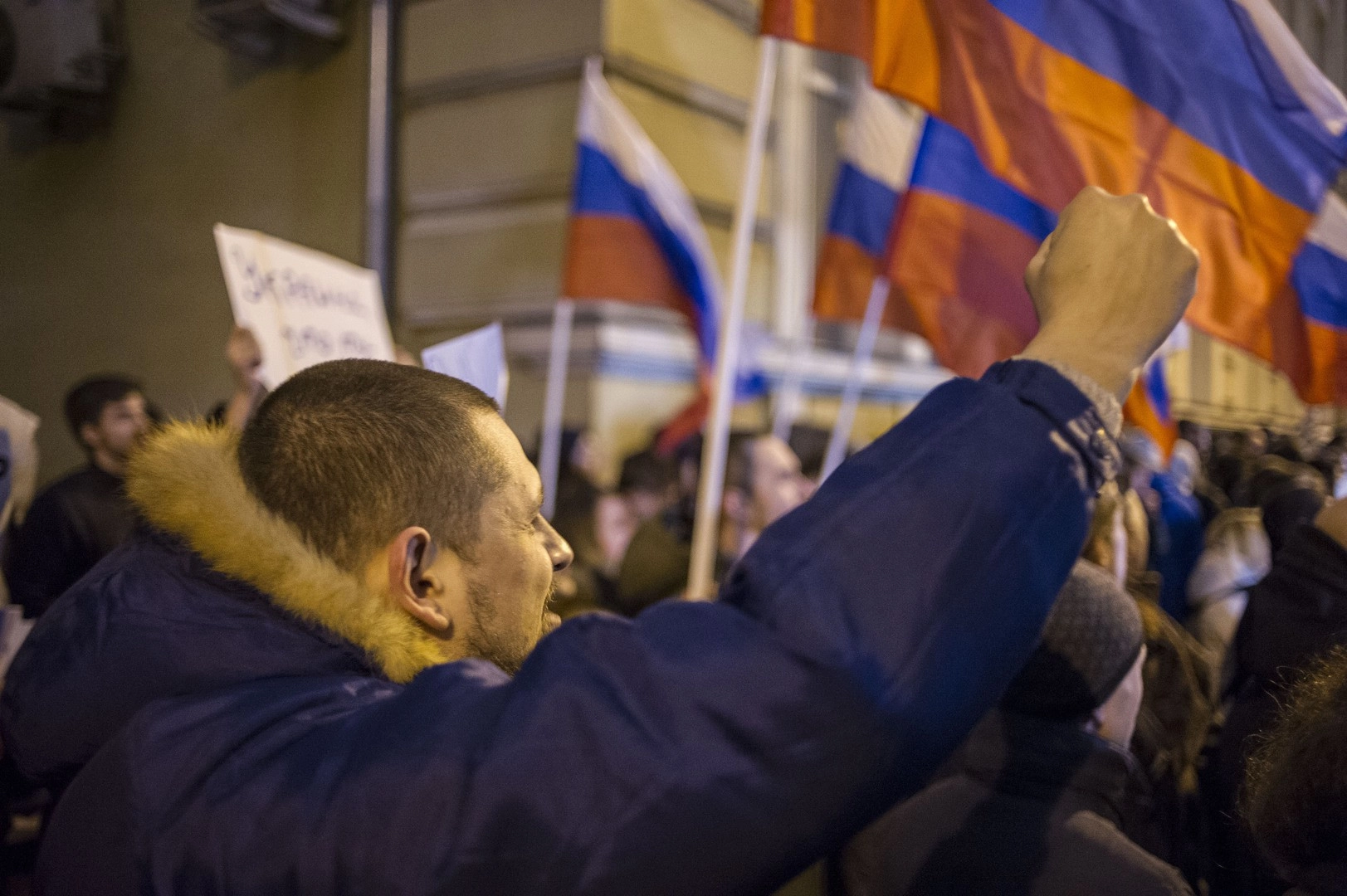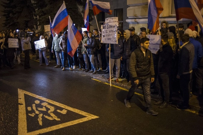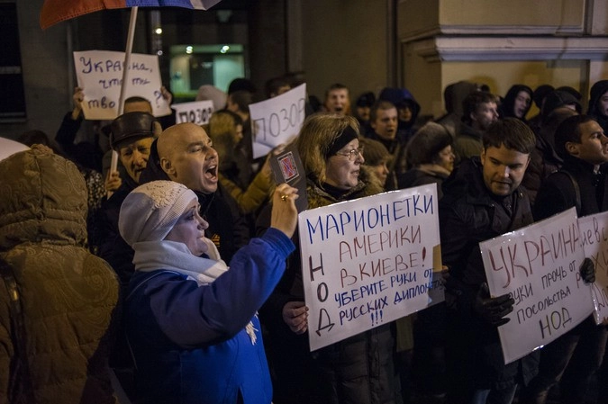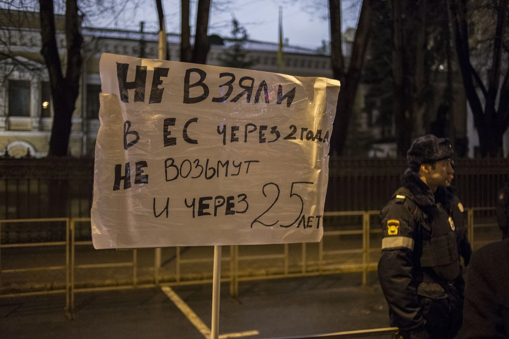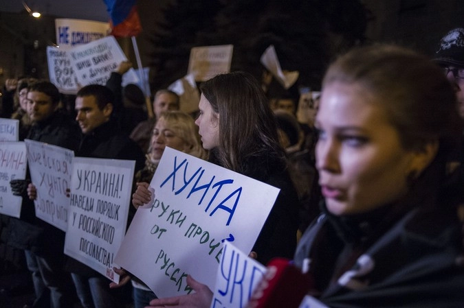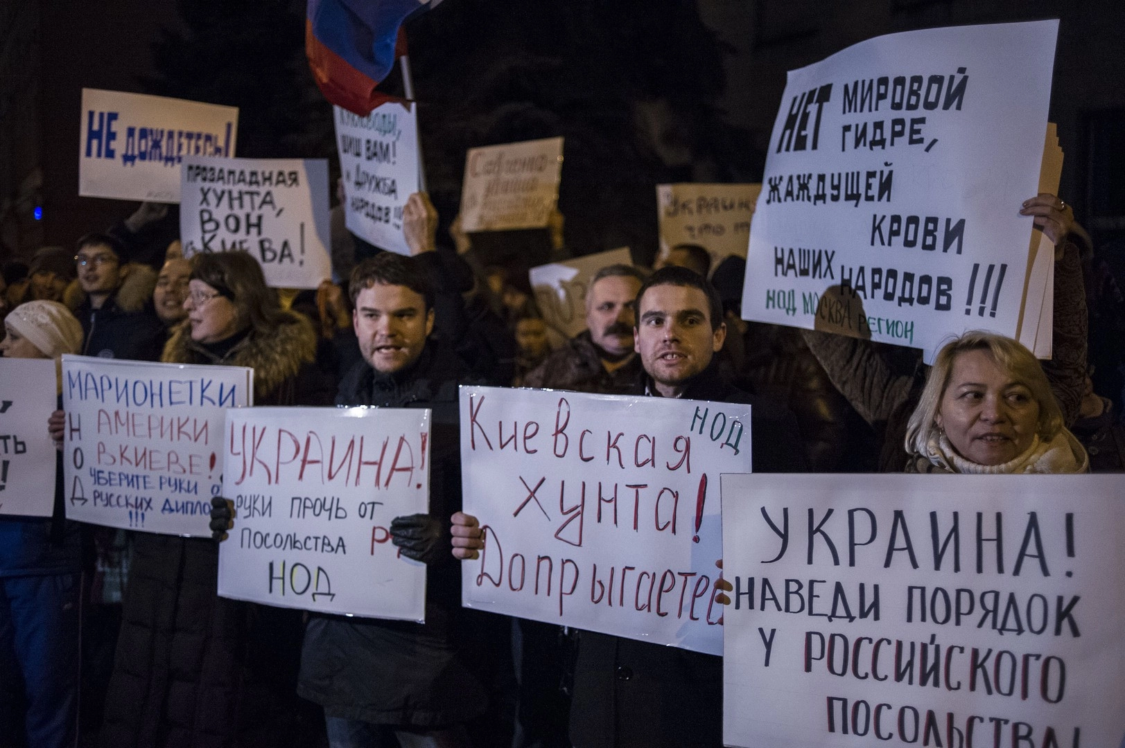 Митингующие скандировали: «Хунта, руки прочь от русских», «Руки прочь от наших дипломатов», «Фашизм не пройдет» и «Не взяли вас в ЕС — и не возьмут!».