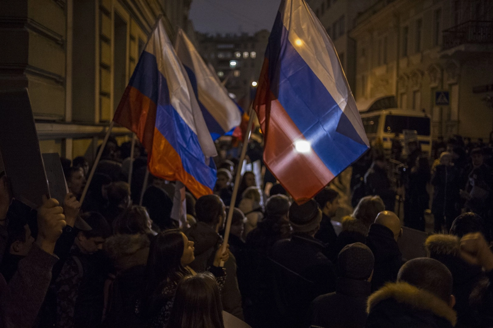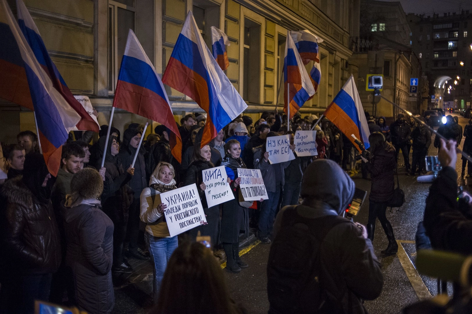 Хлесткие лозунги и и десятки российских флагов — у здания посольства Украины на столичном Леонтьевском переулке прошла мирная акция протеста. Корреспондент «Ридуса» насчитал порядка трех сотен участников акции. Среди митингующих замечена активистка «Народно-освободительного движения» Мария Катасонова.