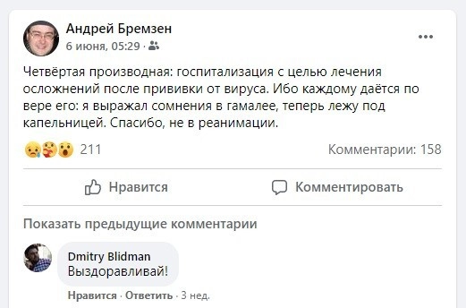 «Вопрос настолько многогранный, что решать его в рамках примитивных навязанных бинарных парадигм я уж точно не буду. Даже обсуждать в Фейсбуке не буду. Не тот формат для такого серьезного вопроса. Тем более, все эти „после не значит вследствие“. Потому что именно вследствие. Вы все, кто стали бойцами вак-ного фронта, несёте ответственность за то, что повлияли на него и подтолкнули сделать пр-вку, несмотря на противопоказания. Сколько бы вы не держали язык за зубами», — подчеркнул математик.