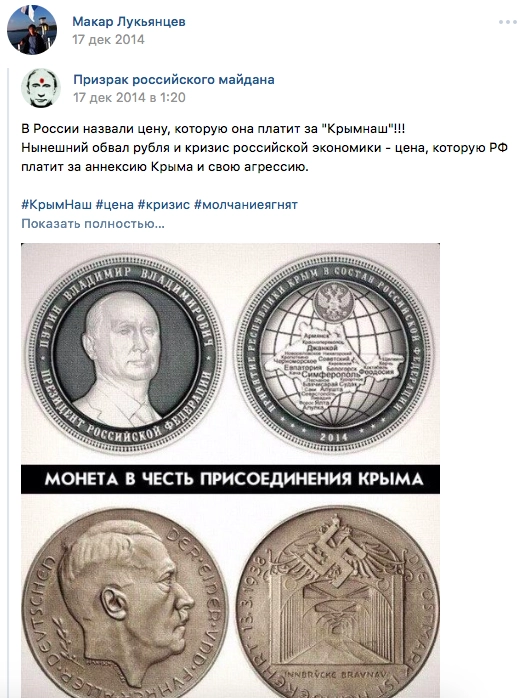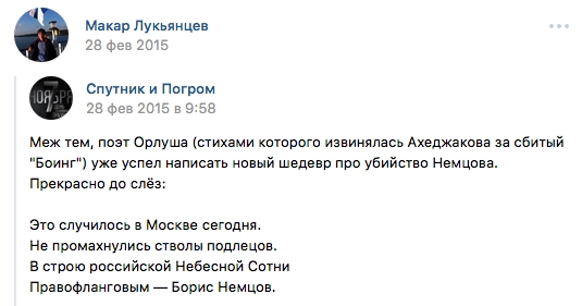 Лукьянцев активно распространяет публикации этих сообществ: к примеру, 28 февраля 2015 года он сделал репост из группы «Спутник и Погром»: