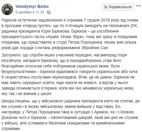 «Редкое эстетическое удовольствие я получил 7 декабря 2018 от появления в программе „Народ против“, что по пятницам выходит на телеканале ZIK, советника президента Юрия Бирюкова. Бирюков — это олицетворение президентского лозунга „Армия. Язык. Вера“, поэтому он сразу же сообщил зрителям, что представляет в студии Петра Порошенко, которому уже несколько лет дает советы по вопросам реформирования Вооруженных Сил», — написал Бойко на своей странице в Facebook.