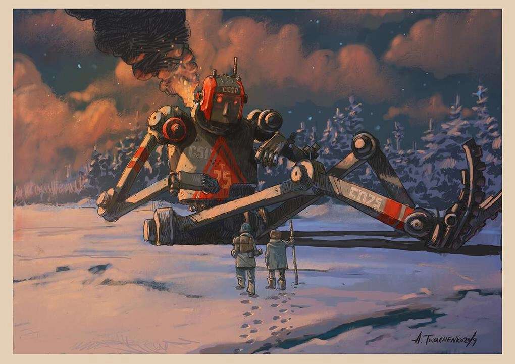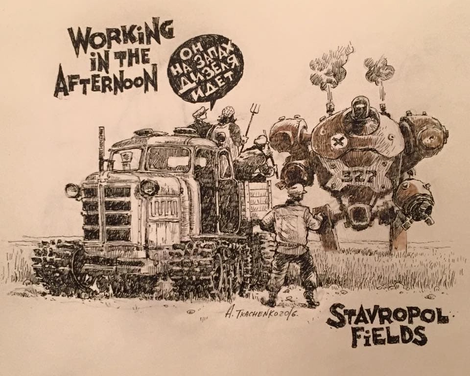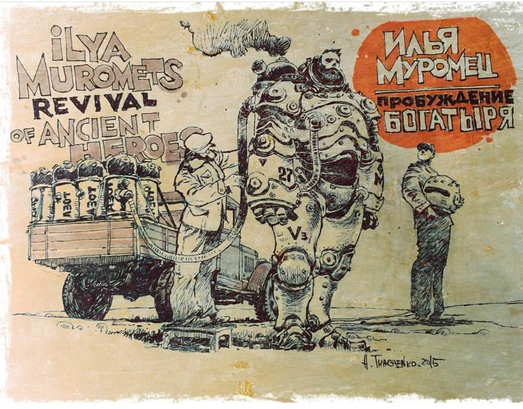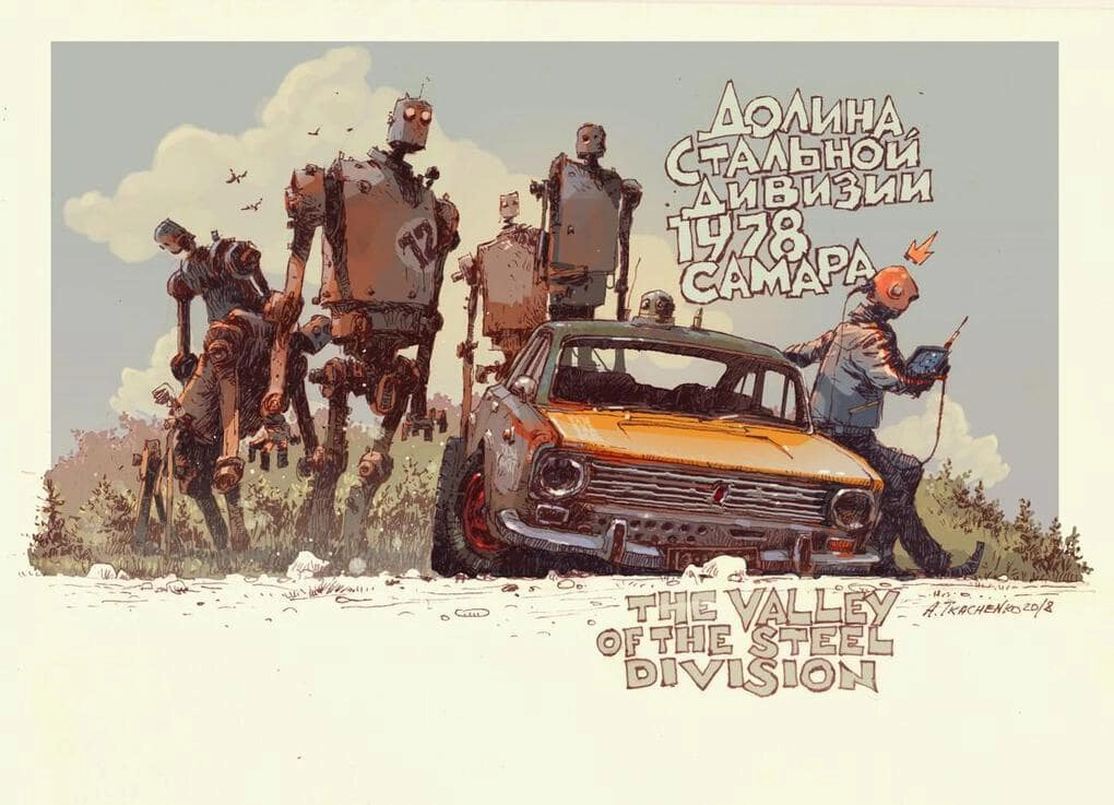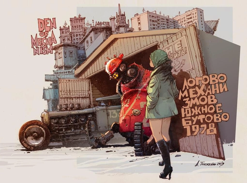 Российский художник Андрей Ткаченко создал удивительный проект, в котором картины из прошлого перемешал с изображениями настоящего и фантазиями о будущем. На выходе получилась невероятная фантасмагория, в которой смешались народные сказки, киберпанк, инопланетяне, советские деревни, люди-роботы, драконы, Чебурашки и российский автопром. Всё это обильно посыпано множеством мелких деталей, нарисованных с таким вниманием и тонким юмором, что вам захочется найти каждый нюанс и рассмотреть поближе. Склеив все эти кардинально разные реальности и параллельные миры, художнику удалось создать фантастический мир, который можно охарактеризовать, как ретро-будущее, если такое вообще возможно. Добро пожаловать в безумное путешествие, где возможно вообще всё.