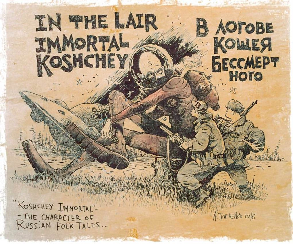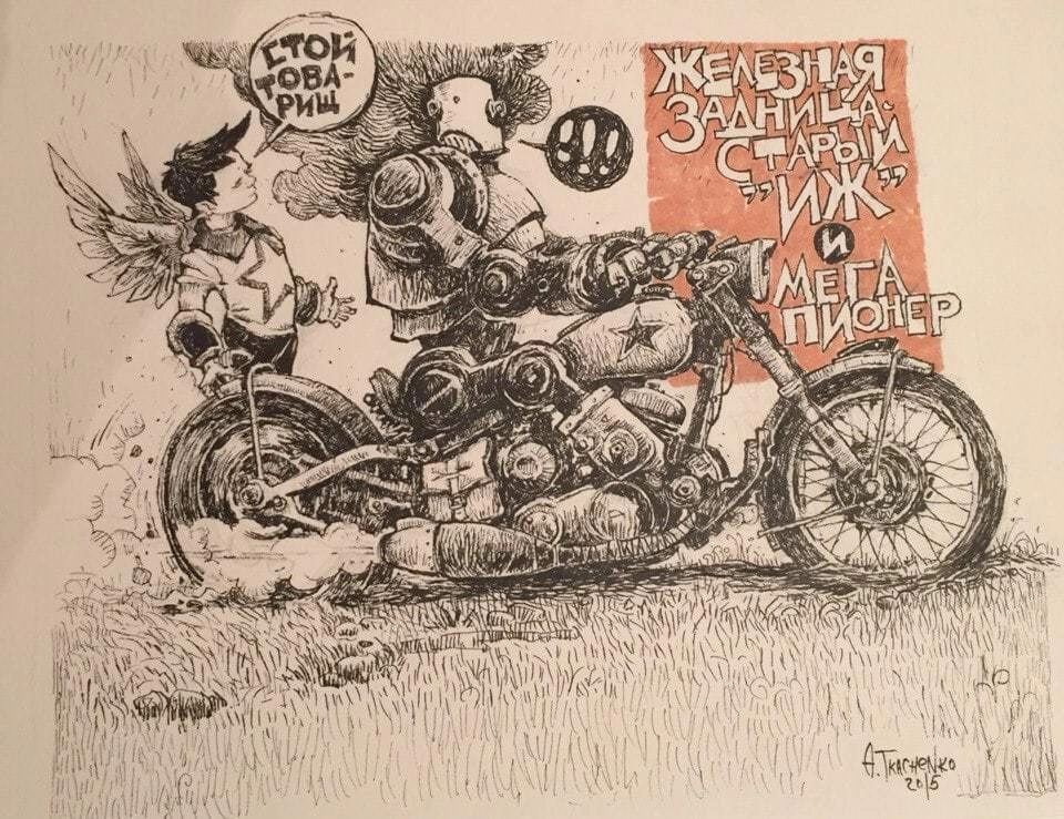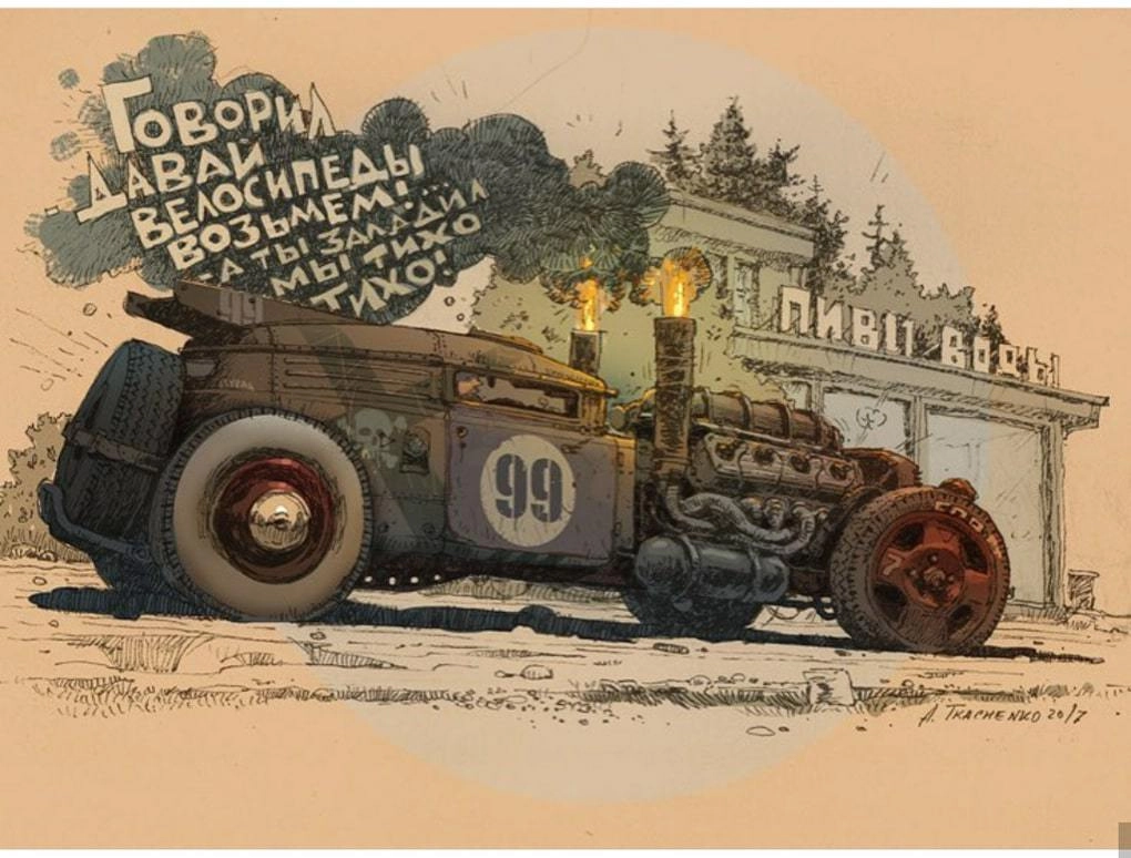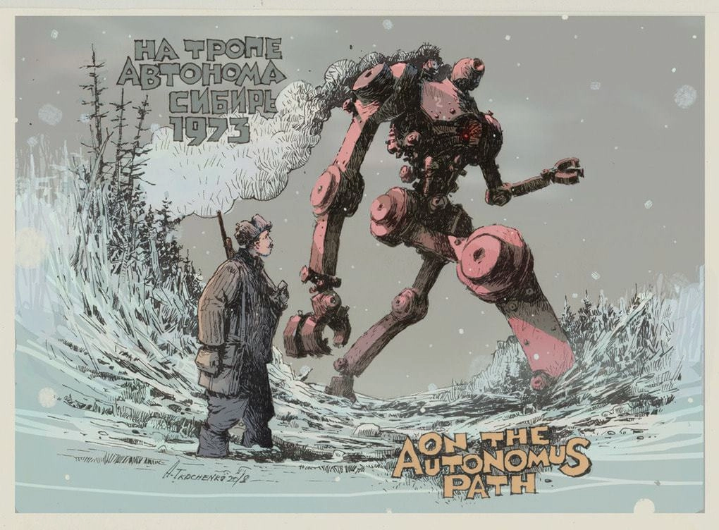 Российский художник Андрей Ткаченко создал удивительный проект, в котором картины из прошлого перемешал с изображениями настоящего и фантазиями о будущем. На выходе получилась невероятная фантасмагория, в которой смешались народные сказки, киберпанк, инопланетяне, советские деревни, люди-роботы, драконы, Чебурашки и российский автопром. Всё это обильно посыпано множеством мелких деталей, нарисованных с таким вниманием и тонким юмором, что вам захочется найти каждый нюанс и рассмотреть поближе. Склеив все эти кардинально разные реальности и параллельные миры, художнику удалось создать фантастический мир, который можно охарактеризовать, как ретро-будущее, если такое вообще возможно. Добро пожаловать в безумное путешествие, где возможно вообще всё.