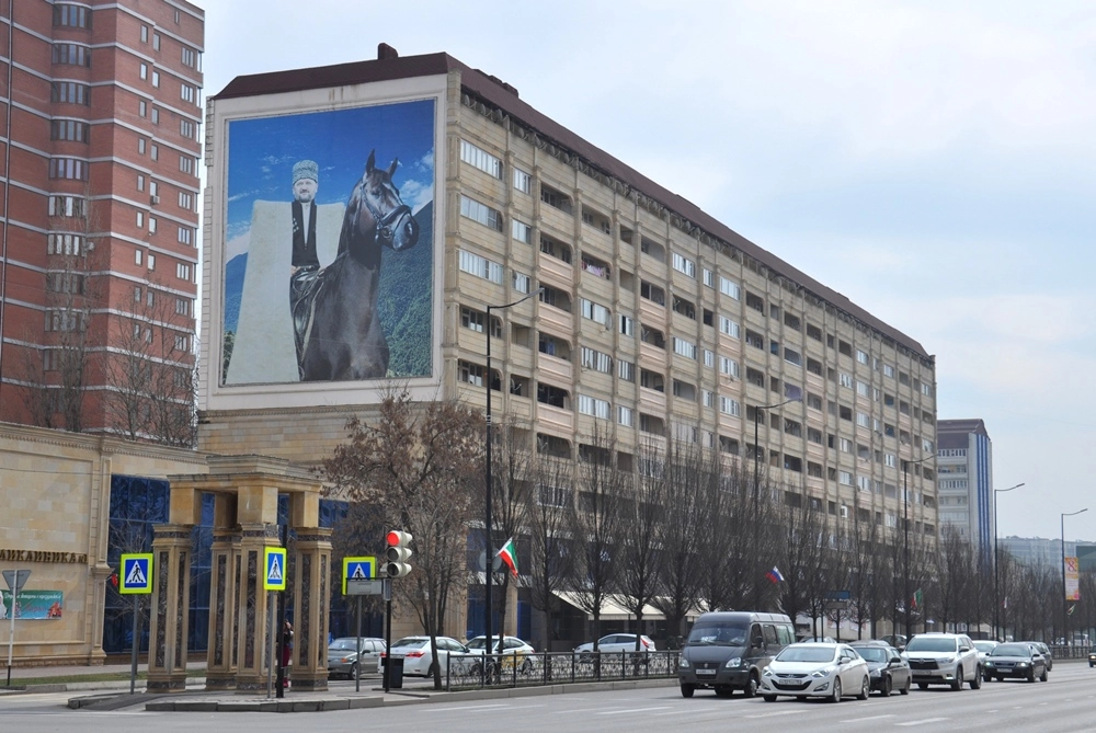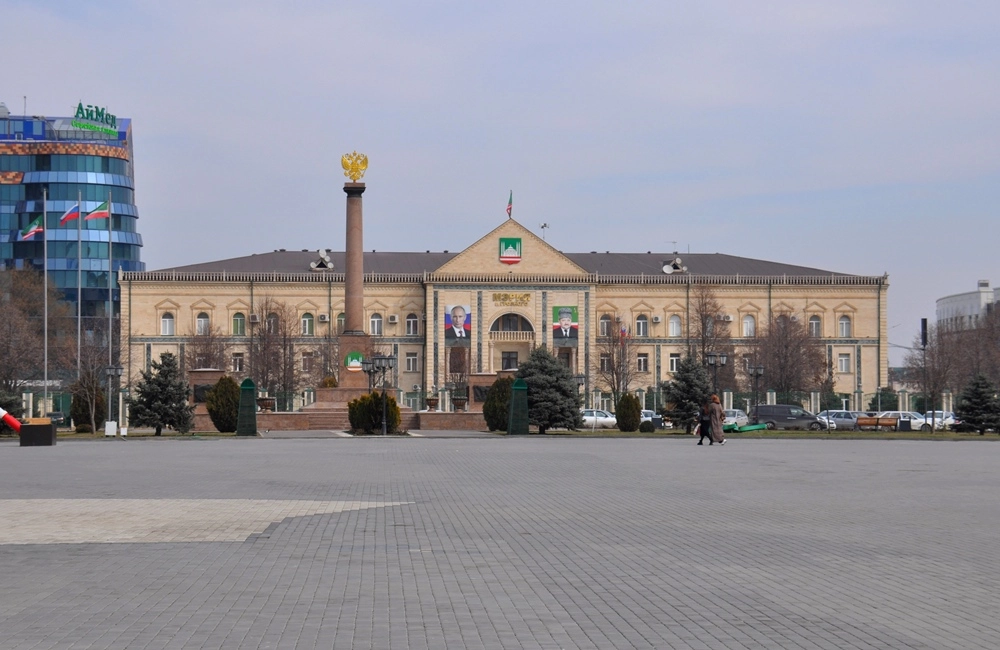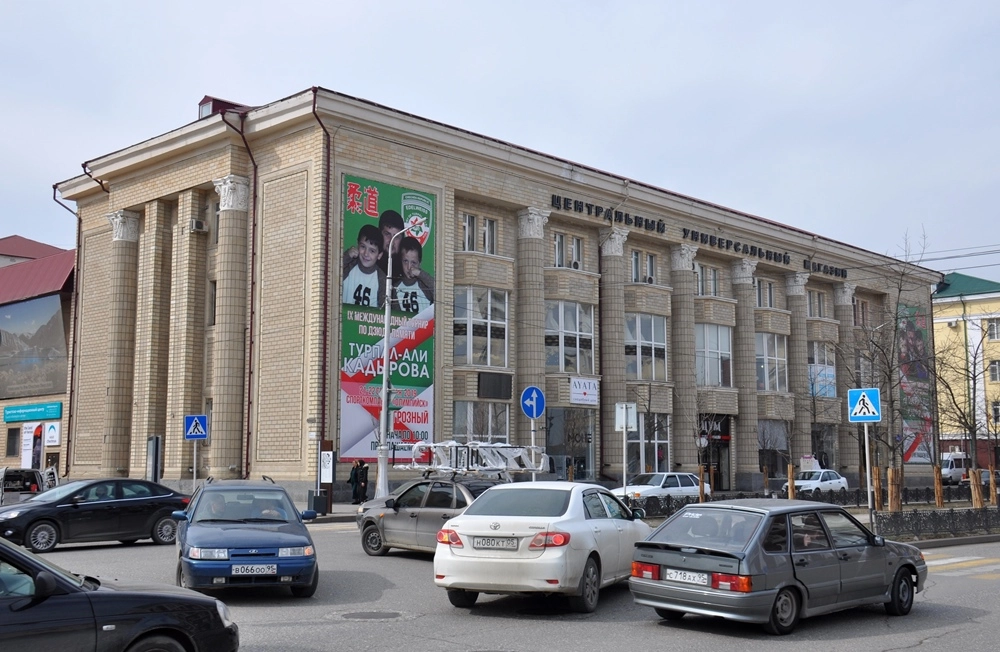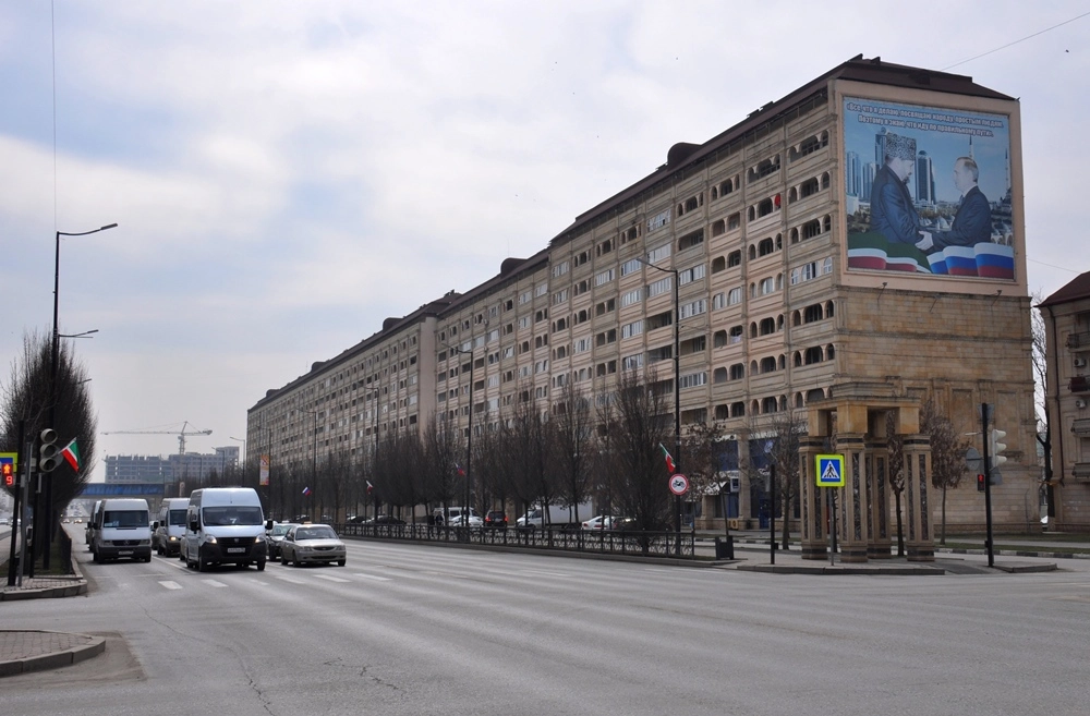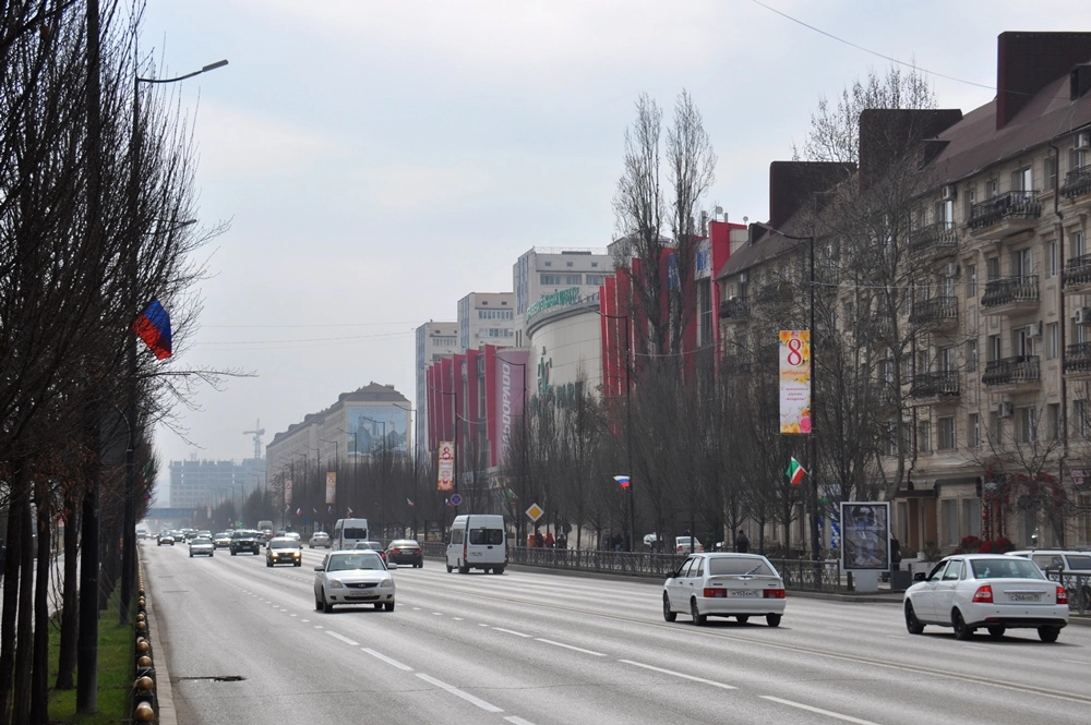 Центральная ось города — соединяющиеся мостом проспект Ахмата Кадырова (на правом берегу Сунжи) и проспект им. В. В. Путина (на левом берегу). Прогуляемся сначала по проспекту Ахмата Кадырова. Во время войны эти места были эпицентром боёв и (как и весь Грозный) превратились в руины. После войны большую часть зданий построили заново, но те, у которых не пострадали несущие конструкции — восстановили.