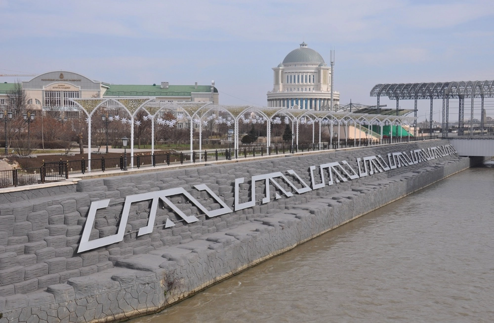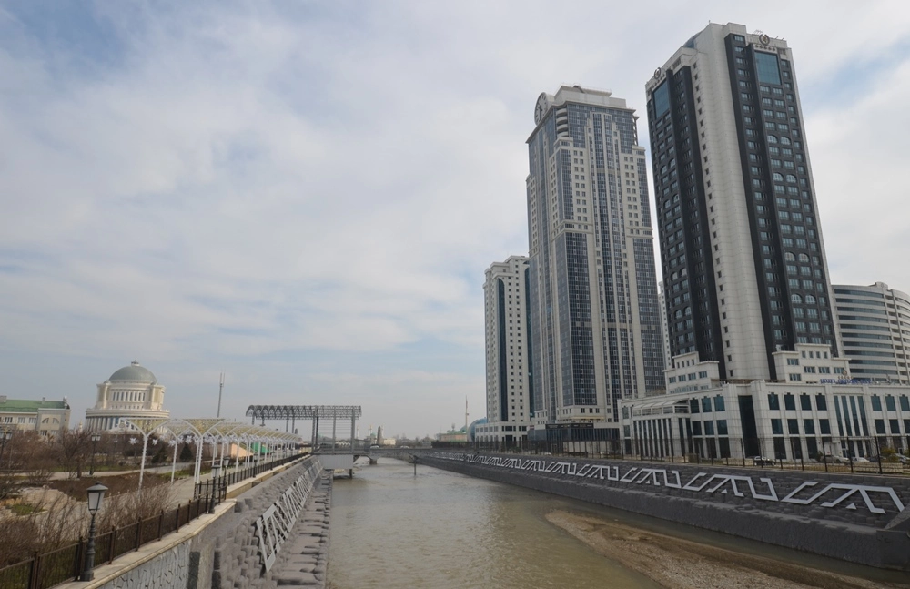 Набережная Сунжи. На заднем плане — Российский исламский университет имени Кунта Хаджи Кишиева (слева) и Дворец приёмов (справа).