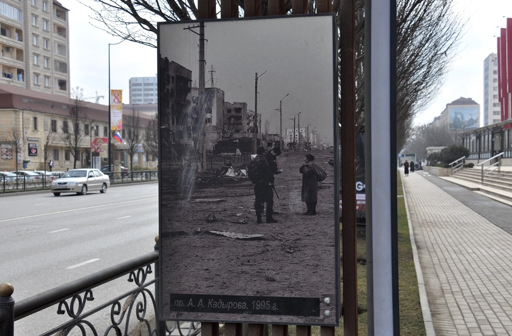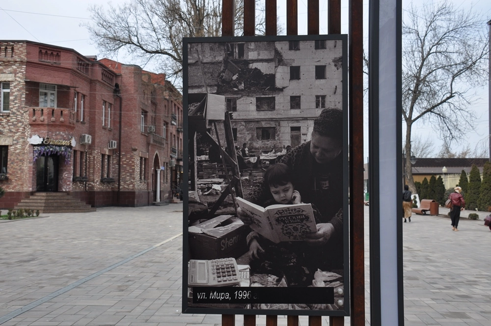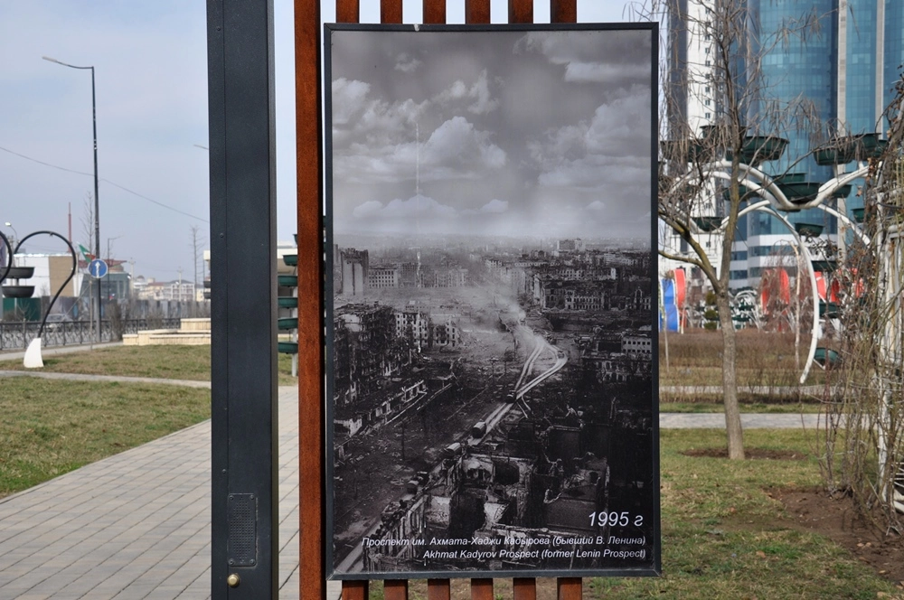 В центре Грозного установлены плакаты, показывающие как выглядели эти места во время войны.
