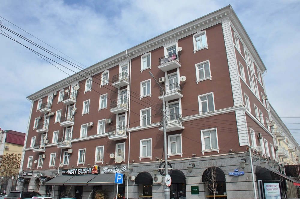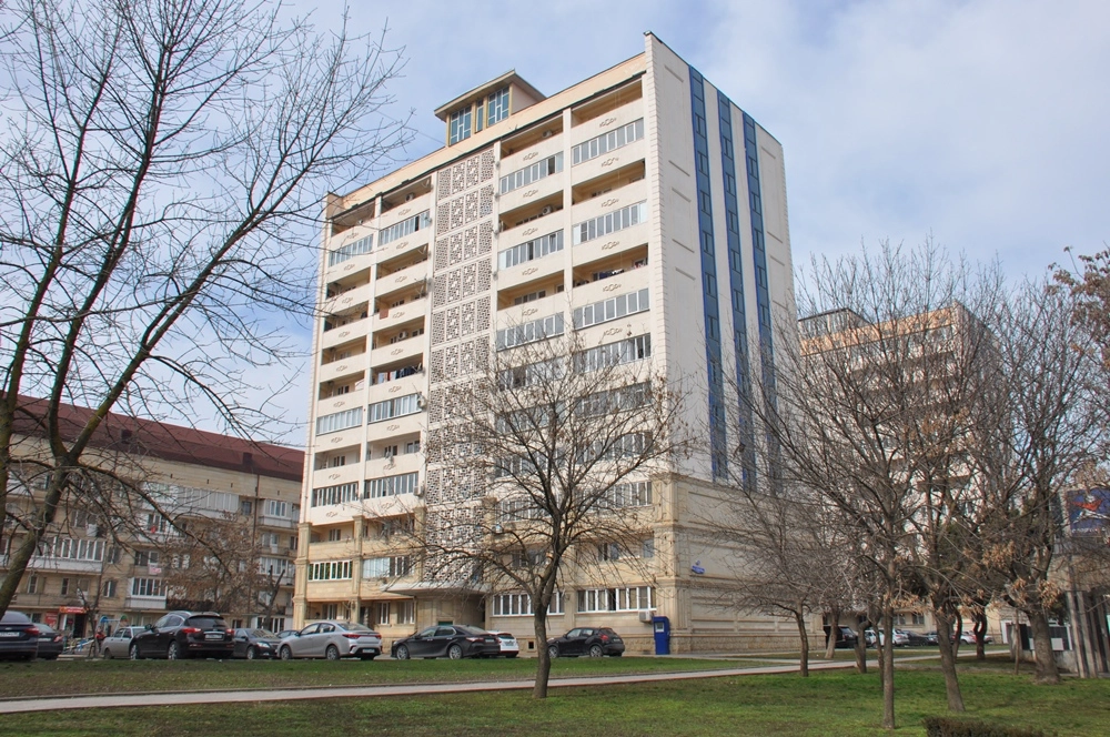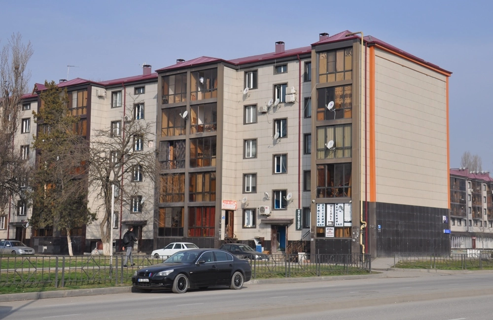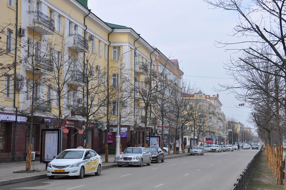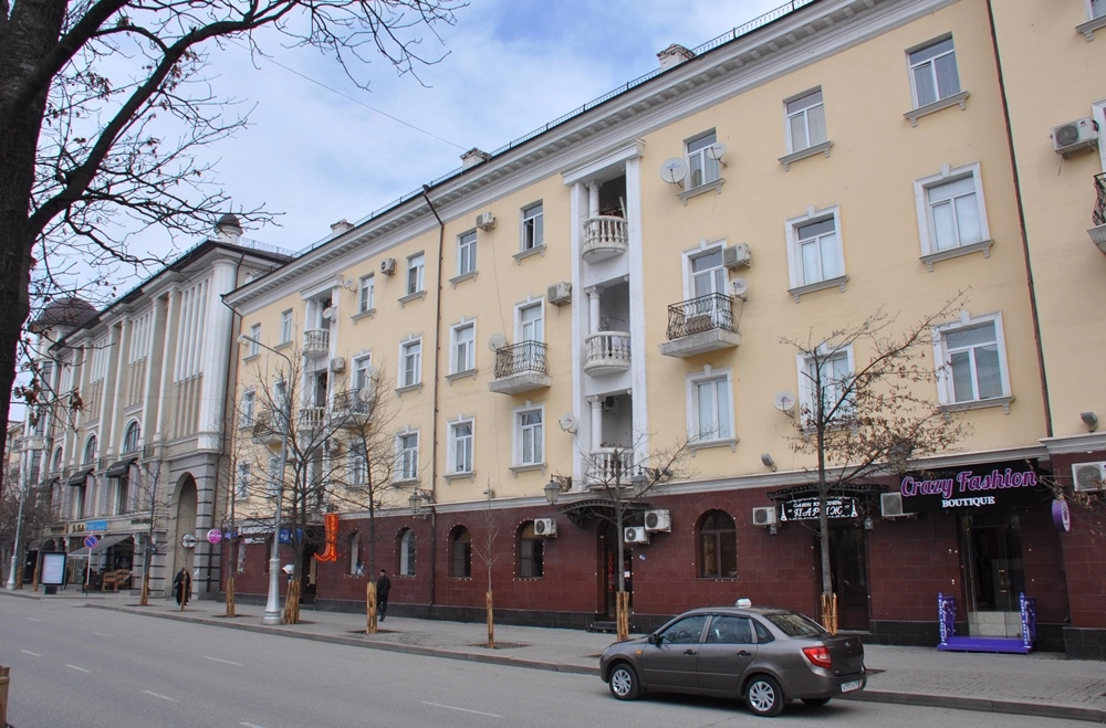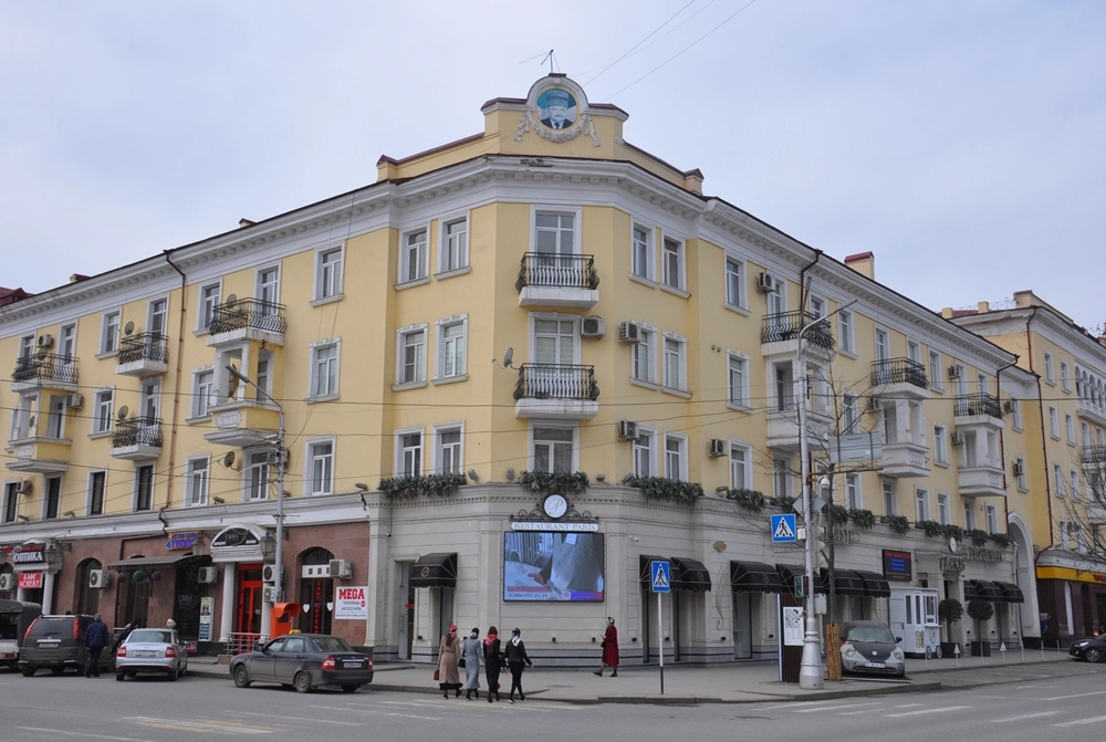 Напротив «Богатыря» находится ещё один похожий дом, только существенно короче. Это уже полностью новое здание. Дальше проспект Ахмата Кадырова ведёт в сторону площади «Минутка», на пересечении с железнодорожной веткой ныряя в туннель, печально известный тем, что в нём в октябре 1995 года на радиоуправляемом фугасе была подорвана машина генерала Анатолия Романова. А мы сейчас развернёмся и по противоположной стороне проспекта направимся обратно к центру города.