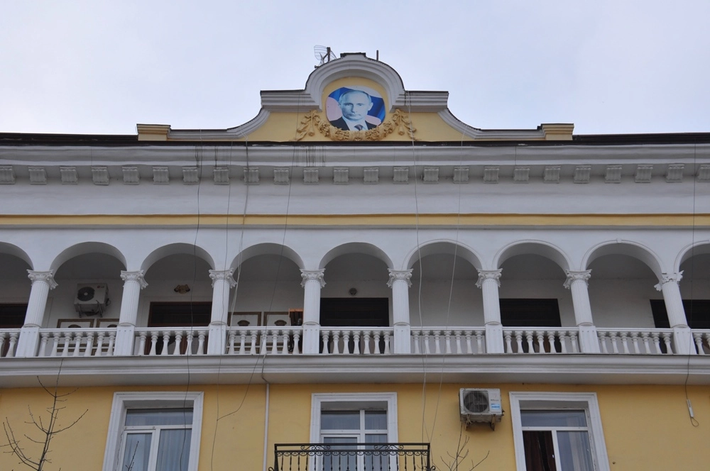 Храм Архангела Михаила. В это время в нём как раз проходила служба, и во дворе видны вооружённые российские военные, обеспечивающие безопасность.