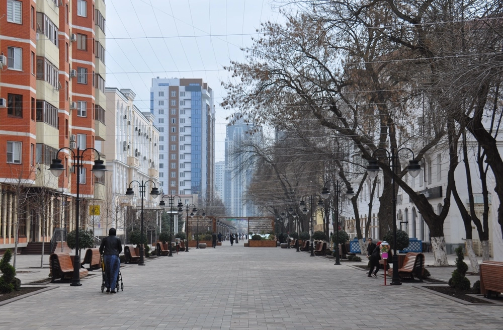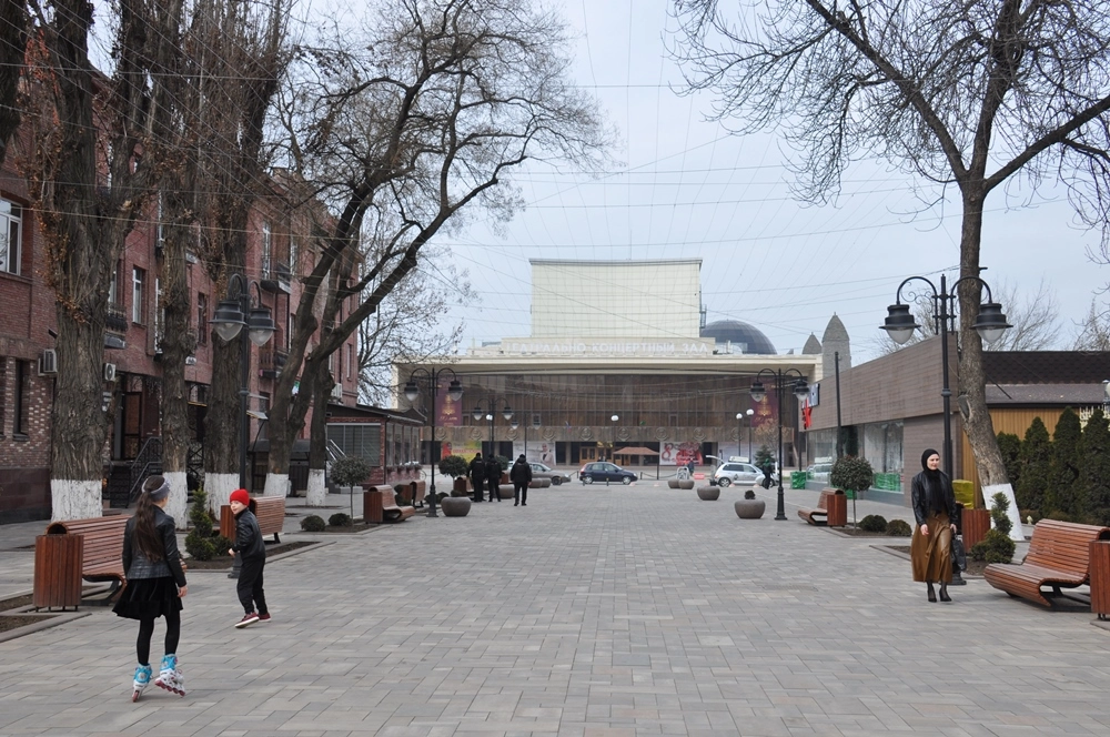 От филармонии в сторону центральной площади ведёт уютная пешеходная улица имени Махмуда Эсамбаева.