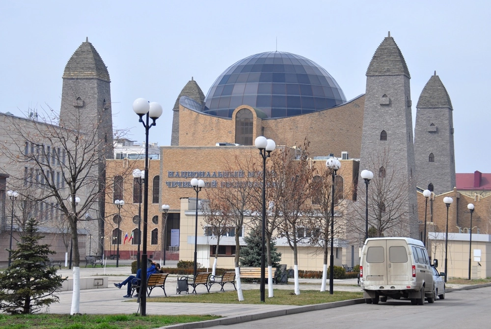Национальный музей Чеченской республики во время войны был полностью разрушен, а большинство экспонатов утрачены. Экспозиции нового музея собирались из частных рук. Я побывал внутри, правда не фотографировал — в музее представлены картины русских и чеченских художников, а также различные предметы быта и прочие экспонаты, рассказывающие об истории чеченского народа.
