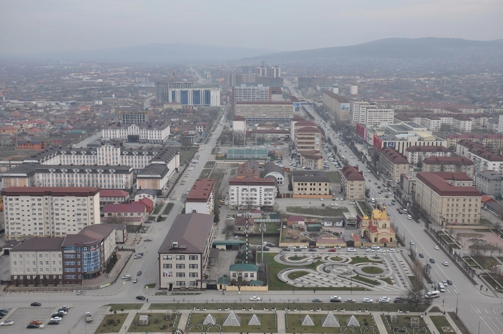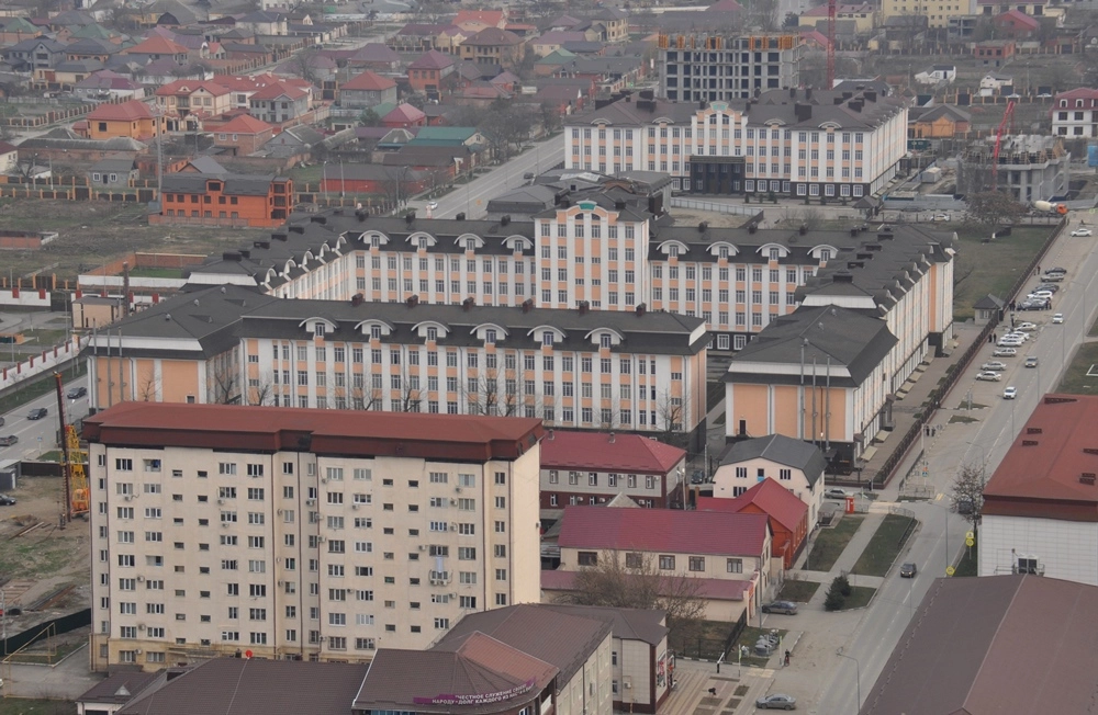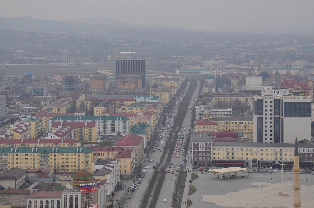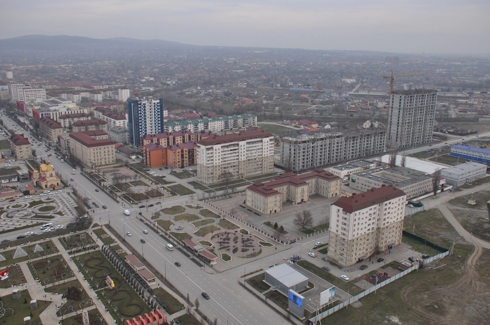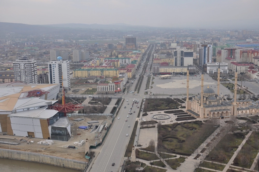 Взгляд на северо-запад, в сторону центральной площади, мечети «Сердце Чечни» и проспекта им. В. В. Путина.