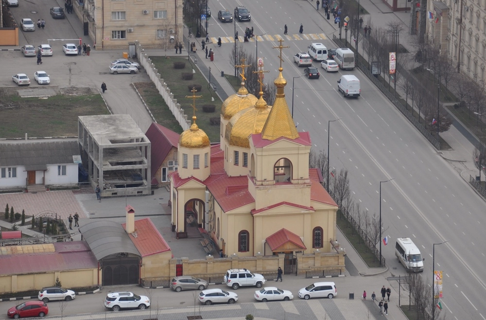 Православный храм Архангела Михаила был построен в 1892 году, во время чеченских войн практически полностью разрушен и восстановлен в 2004—2009, 2011 годах. Перед поездкой в Грозный читал в ряде отзывов других путешественников мнения, что этот храм, мол, существует в мусульманской Чечне просто «для галочки» — как символ толерантности послевоенной республики к людям разных национальностей и религий плюс, что называется, «для туристов», — а в действительности в него якобы никто и не ходит. На самом деле это не так — в тот день, когда я гулял по Грозному, в храме как раз была служба, и я зашёл. Внутри было около 50 человек народу — мужчины, женщины, дети. Как русские, так и других национальностей (может быть, осетины или ещё кто-то). В храме — расписание богослужений на месяц вперёд. Так что, несмотря на то, что нечеченское население республики сегодня составляет лишь около 5%, а немусульманское — и того меньше, православный храм в Грозном действует и востребован.
