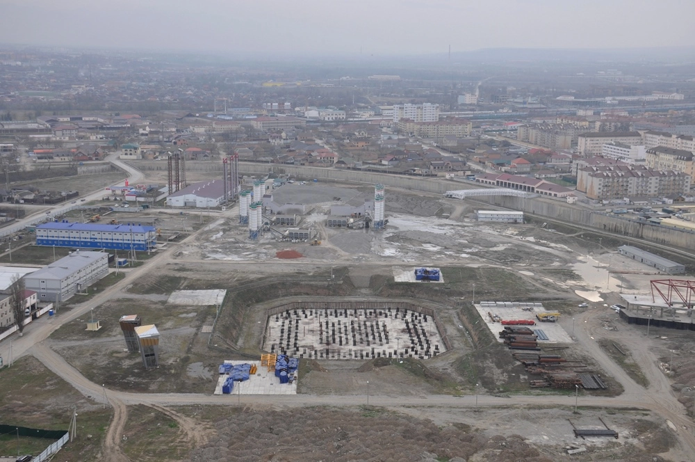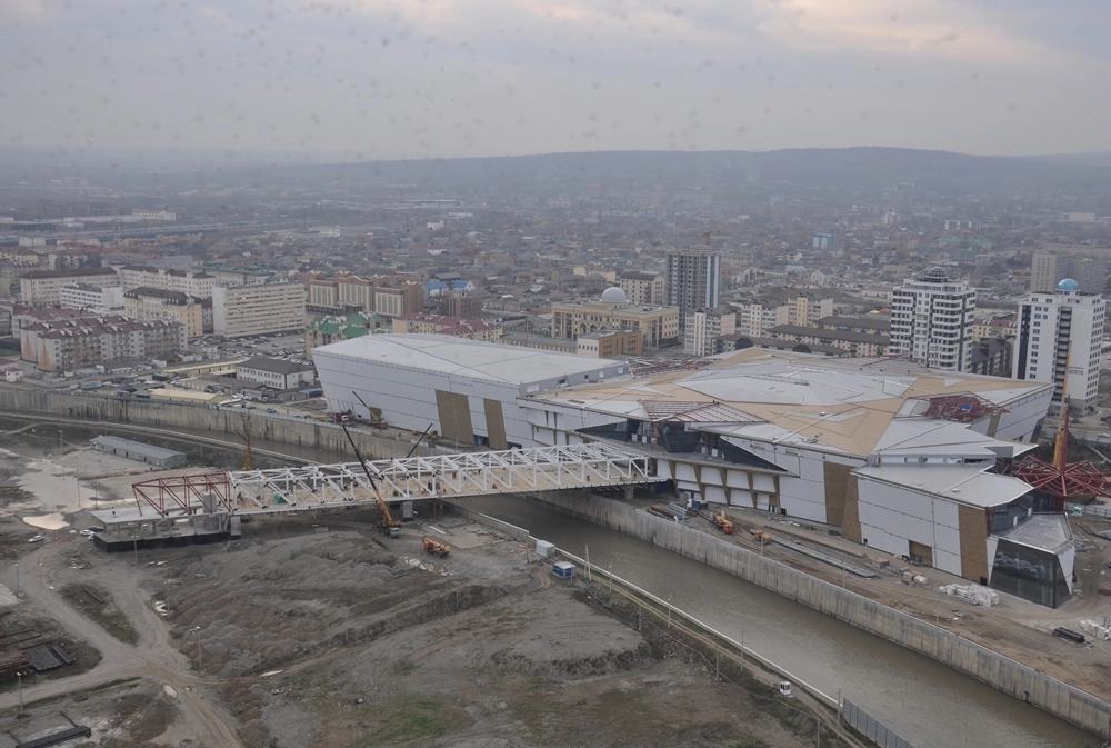 Взгляд на запад. Хорошо видны стройплощадка и почти готовый котлован нового небоскрёба «Ахмат-Тауэр», который должен быть построен через несколько лет. Этот 102-этажный 435-метровый небоскрёб станет вторым по высоте небоскрёбом России — после «Лахта-центра» в Санкт-Петербурге.