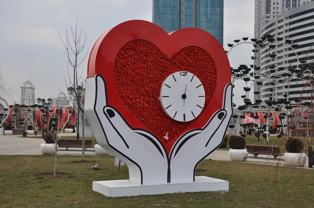 Интересная композиция «Сердце с часами» на площади перед небоскрёбами. Часы на двух сторонах сердца не ходят и показывают разное время, и сделано это специально — «влюблённые часов не наблюдают».