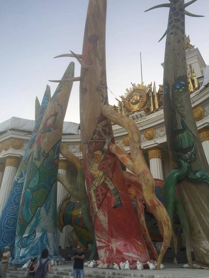 А у стен павильона номер один — который со шпилем и звездой — стоят огромные надувные рога и припаркованы гигантские надувные рыбы-динозавры. Современное искусство. И ведущая звенящим от восторга голосом объявляет, что сегодня будет перформанс, специально сделанный французской арт-группой для ВДНХ. Парад этих гигантских фигур по главной аллее.