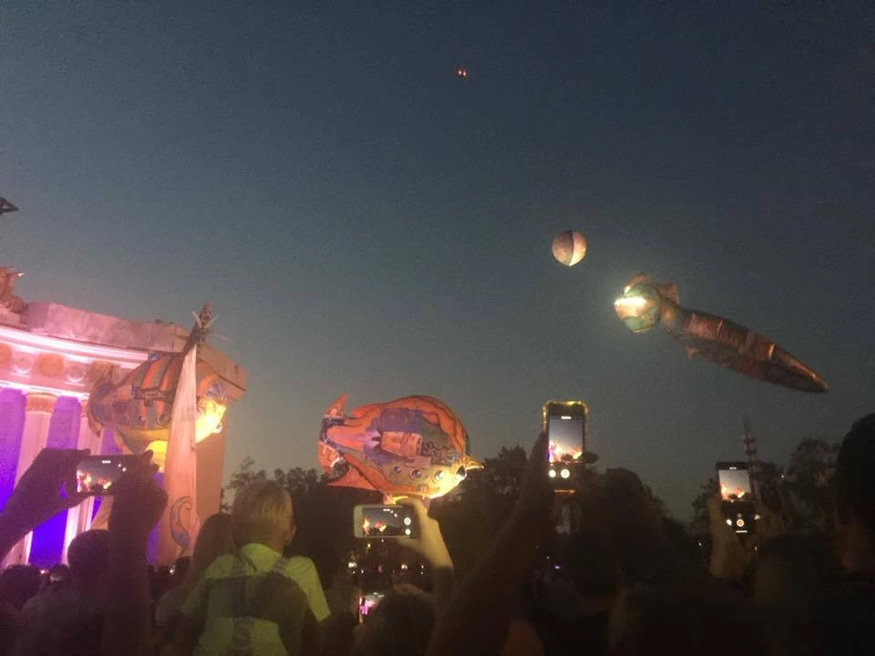 Надувные рыбы плывут между фонарей, на фоне подновленных и подсвеченных зданий, пульсирует музыка, ВДНХ становится живым пространством сказки и мифа. Дети орут от счастья. Я так восторженно пишу, потому что это правда было очень здорово.