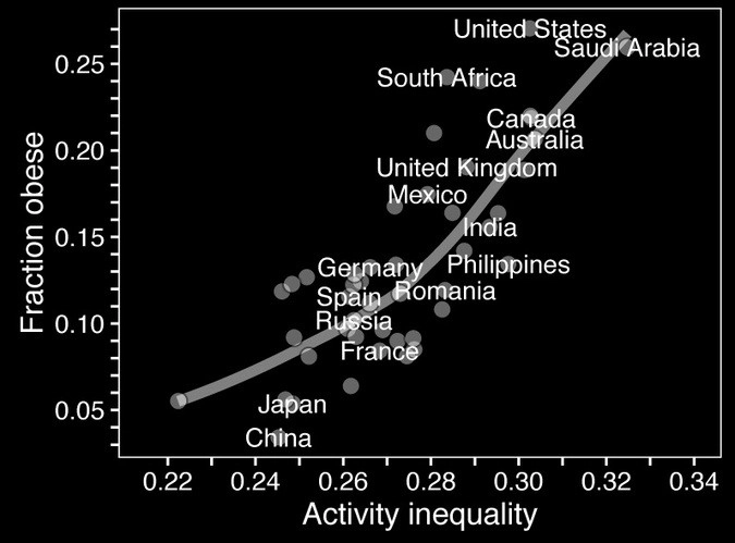 При анализе данных учёные заметили, что в странах с небольшим ожирением люди каждый день ходят примерно одинаково. В других странах, где зафиксирована большая неравномерность активности, население на 196% чаще страдает ожирением. Такая ситуация наблюдается в Саудовской Аравии, Египте, Канаде, США и Австралии. Самая маленькая разница между «активными» и «ленивыми» жителями была выявлена в Гонконге, Китае и Швеции. Россия по этому показателю заняла 14-е место.