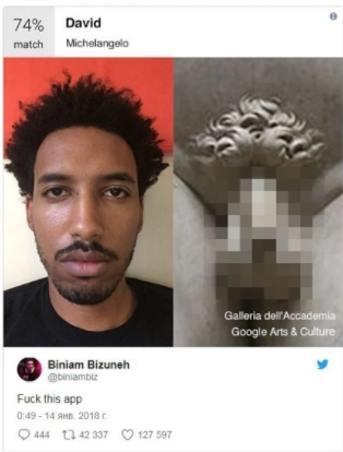 Но случаются и курьезы. Пользователю с именем biniambiz немного не повезло. Молодой человек, по мнению искусственного интеллекта, подбирающего двойников, на целых 74% оказался похож на фрагмент великого творения Микеланджело — половой орган скульптуры Давида.